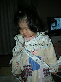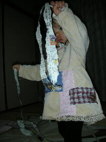 家に帰るとみーちゃんがママのカーディガン を着ていました。楽しそうです。