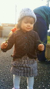 夕方、パパと3人で花壇の整備しました。みーちゃんは赤いお気に入りの花 を持って、嬉しそうに歩きまわっています。欲張って、どんどん花が増えていき、ブンブン振り回しています。動きが早すぎて写ってないけど 、左手にも花を持って振り回してます。かぶっている帽子 は去年 大ばあちゃんが編んでくれたもの。入らないかも?と思っていたけど、今年までは大丈夫そうです。