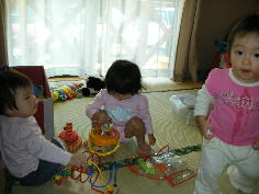 今日は昼からま○ちゃんのお家 に遊びに行きました。はな○ちゃん親子も一緒にワイワイにぎやかで楽しかったぁ ちびちゃん達はオモチャ を取り合いながらも一緒に?遊んでいました。一緒にと言うよりはそれぞれ一人遊びって感じで、楽しんでるのは親だけって感じもあるけど^-^;