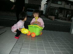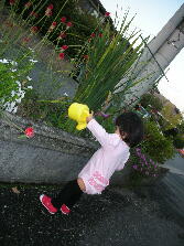 帰ったあと、少し家の周りをお散歩。みーちゃんはオモチャのじょうろ で、花壇 になっているスイカに水をあげてました。水は入ってないんだけどねぇ。近所のお姉ちゃんもお外に出てきてたので、初めて一緒に遊びました。みーちゃんは、さすがにずっと起きてて疲れたみたいで、家に帰るとすぐに寝ちゃいました。夜もめずらしく早く寝ちゃったし。いいことです