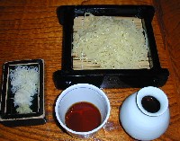 ソバツユは、ソバとともに供される大根の絞り汁と生醤油を調合して、自分の好みの濃度のツユを作成する。生醤油はかなり濃いので、少しずつ加えていったほうがよいだろう。さらに、そのまま食べてもおいしい薬味の良質な削り節を、これに適量加えれると、鰹ダシの風味を補うことができる。絞り汁の辛味があるので、薬味のワサビは不要な気がする。食後のソバ湯は、大きな湯呑み茶碗に注がれたものが供せられる。