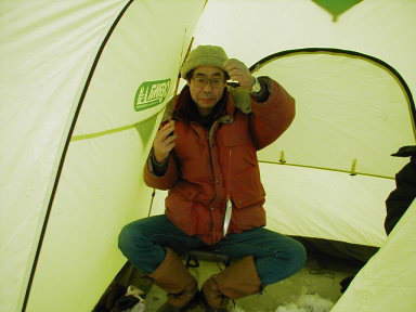 翌日25日は7時半ホテル発。途中のコンビニでおにぎり2個を買って、車中で食べ、目的地の風連湖にチカ釣りに行った。風連湖は汽水湖で、氷が厚く張っていた。平日にもかかわらず、到着したときはすでに多くの釣り人が釣りをしていた。適当なところに、氷の穴あけ機で直径15センチの穴をあける。その上にテントをはり、そのなかで釣りをおこなうというしくみである。テントのなかとはいえ、けっこう寒かった。7,8本の疑似餌の針のついた竿で上下させながら釣るのである。チカはワカサギを一回り大きくしたような魚だ。最初はなかなか釣れなかったが、釣れ出したら、たてつづけに当たりが来た。それがまた、ピタッと釣れなくなるという繰り返しである。アンドレイが持参した炭で釣ったチカを焼いて食べた。(写真はいずれも不破理恵さん撮影)