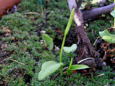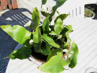 ヒトツバ 静岡県清水にある遠洋水産研究所の ヤシの樹幹に着生していたのをすこし 採ってきたのが大きくなったもの。 (2005年5月7日撮影) |