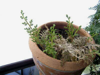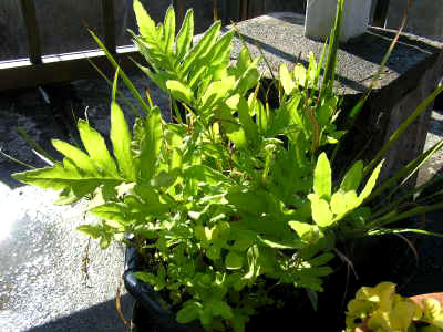 ヒロハハナヤスリ 3年前につるバラの鉢に偶然生えはじめ た。 (2005年5月7日撮影) |