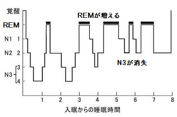 睡眠サイク ルを繰り返すにしたがい、Nが消失する。REMの継続時間は増えてい く。
