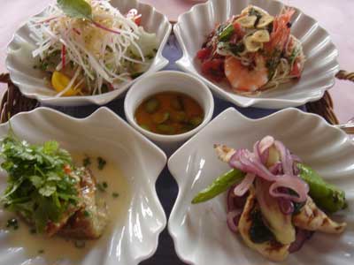 | パンケットランチとは、籐のバスケットに帆立貝のお皿を並べ、フルコース料理(アミューズ、前菜2皿、魚料理、肉料理)を盛り付けたラマーレ風松花堂弁当。箸で食べてもOKです。 | |