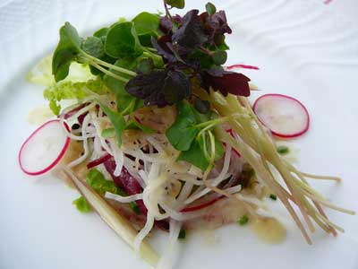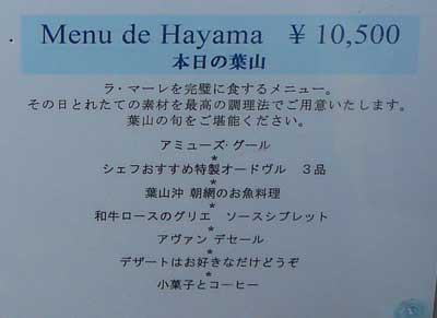 | ランチコースの他に、プラージュコース(7350円)というのもあります。メニューは、こちらでどうぞ。 | ワンダフルハウスは葉山コースに決めました。和牛を葉山牛に変えてもらって、ワゴンデザートに熊谷喜八シェフの伝説のアントルメを並べてもらうのです。 |