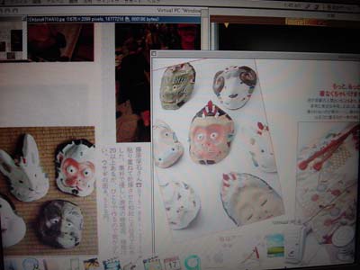 | 金子さんは、遥か昔(1960年頃)、文化服装学院の修学旅行で京都に行った時におたふくの嵯峨面を1つ買ったそうです。それから27年後の1987年、栗崎昇さんとの京都旅行で運命的な再会を果たします(クロワッサン1987年9月25日号)。先斗町のバーの壁にかかっていた和紙を貼り合わせて作られたウサギの面。裏を返して見たら、おたふくのお面と同じ作りだったのです。「うわー、これだ!」作者も、どこで売っているのかもわからないけれど、素朴で優しい表情と上品な色使いに一目惚れ。あちこちに電話をかけ、何人もの人を通して辿り着いたのが、嵯峨二尊院近くで一人でこの面を作っている藤原孚石さんだったのです。金子さんと甘糟さんのコレクションを見比べてみると、ウサギのお面が全く同じ物であることがわかります。 |