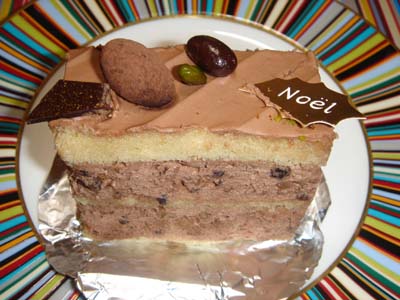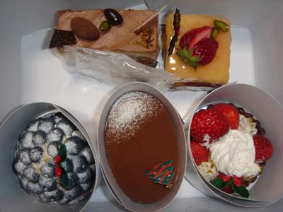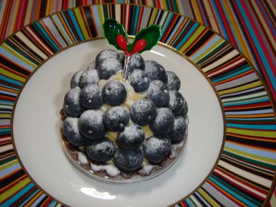 | 「ブルーベリーのタルト」(630円)。この値段はクリスマス価格で、普段は525円。サクリと音を立てるタルト生地の上にブルーベリーが目に良いというのは、第二次世界大戦中のイギリス空軍が発見しました。ある英国人パイロットは夜間の空中戦でも敵がよく見えているということが報告され、彼について調査したところ、故郷のブルーベリージャムを愛用していたとか。これをきっかけに、ブルーベリーの研究が始まったのです。物を見る時、光が物体に当たり、目に飛び込んできた光は、網膜というスクリーンの役割をするところに像を写し出します。この網膜にはかなり薄い膜の層がありその表面にロドプシンという色素があります。ロドプシンは光を受けると壊れてしまいますが、すぐに再合成され、網膜ではロドプシンの再合成が繰り返されています。その働きを助けるのがアントシアニン。ブルーベリーにはアントシアニンが豊富に含まれています。ブルーベリー粒は、1日中パソコンで仕事をしている方にお勧めのサプリメント。このタルトは現代人の健康生活をサポートしてくれる健康食品なのです(^Q^) | 「クリスマスチョコレートショート」(525円)。クリスマスショート(525円)もあったそうですが、早々に完売したそうです。厳選したチョコレートを使った生チョコクリームのショートケーキ。クリスマスの時期だけ販売されている商品です。 |