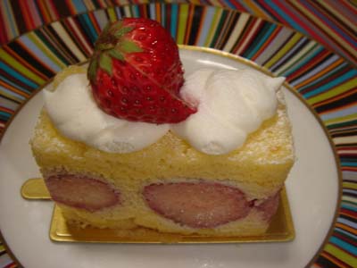 | クリスマスバージョンの「フレジェ」(630円)。フランスには、”苺のショートケーキ”というケーキはありません。フランスのショートケーキとも言えるのが「フレジェ Fraisier」。カスタードクリームとイタリアメレンゲで作ったバタークリームを合わせたクレーム・ムースリーヌで苺をサンドしたケーキ。苺がクリームのしつこさを和らげ、苺の風味を充分に引き出してくれるケーキです。キャンティのは、上のゼラチンの部分(上掛けゼリー)が透明で、何の味かわからない不思議な味でしたが、超美味でした(^Q^) | こちらは、普段販売されている「フレジェ」(525円)。クリスマスに販売されたものに比べるとゼリーが乗ってなくて、代わりに生クリームが乗ってます。 |