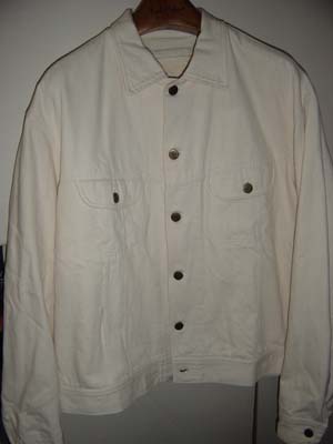 | 鮮やかなブルーのネルが身頃だけでなく袖の裏まで付いてるんです。Tシャツ+Gジャンだけでも、ネルシャツを着た時と同じくらい暖かくて、春先や晩秋に重宝してます(^‐^) ステッチは白。背中は無地。 | こちらは、色違いでホワイトデニムのGジャン。やはり裏地に白いネルが付いています。ホワイトGジャンも1枚は持っていたいアイテムです。 | |
