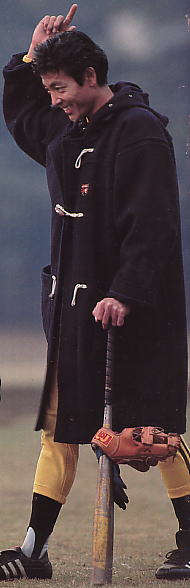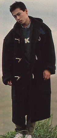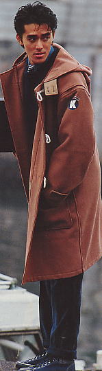 ダッフルコート¥62,000(カールヘルム1987年冬物) 胸にはカニの刺繍。野球のユニフォームの上に無造作に羽織ってるのがお洒落だ。これはスタイリストが撮影のために借りたものではなく、恭兵さんが買った私物である。当時の柴田恭兵というとメンズティノラスのイメージが強いが、ティノラスはドラマのタイアップで着ていただけで、ゴルフの時などプライベートではカールヘルムやボイズキットを着ていた。彼はVANを着ていたアイビー世代なので、当時のデザイナーズブランドでは最もアイビーに近かったカールヘルムを選んだのであろう。 メンズノンノ1988年2月号(No.21)「柴田恭兵・大研究」より |