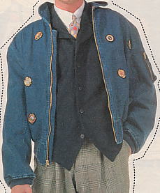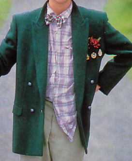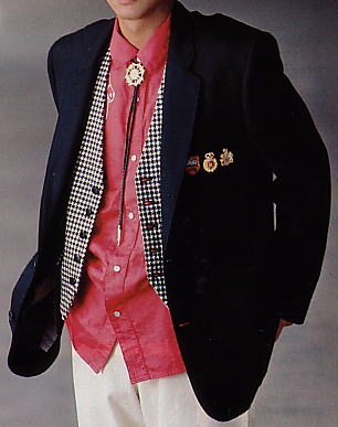 | シングルのウールモッサジャケット。ブレザーを演出する大切なポイントとなるエンブレムも、カールヘルムだとご覧の通り。本来のトラッドではマスト・ハブとも言えるエンブレムを思い切って胸に3つも飾っちゃうあたり、ルールにとらわれず遊び心に溢れてる。写真のボロータイは、カールヘルムでは作らなかったが、この当時、爆発的に流行した。ジャケット¥49,000(カールヘルム)、シャツ(ブルー・オン・ピンク)、ベスト(ワークス)、パンツ(バルー)、ボロータイ(メンズフランドル) | ベーシックなブレザーに派手なシャツとタイを合わせて、チェック・オン・チェック。ダブルのウールモッサジャケット¥65,000、シャツ¥14,800、パンツ¥14,000、蝶ネクタイ¥3,800(カールヘルム) |