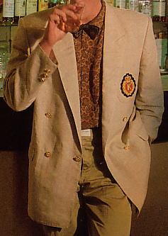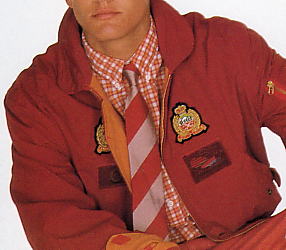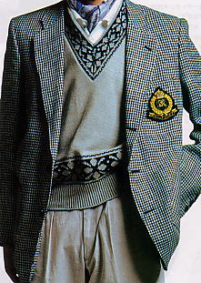 | 千鳥格子の麻のジャケット¥54,000(カールヘルム)、ベスト¥14,000(デュプレックス)、ポロシャツ¥6,800(アバハウス)、スカーフ¥7,800(クリケット)、パンツ¥16,000(スクープ マン) | エンブレムとラベルが組み合わされたタイプが新登場。この商品は、2段だが、秋冬には3段以上に進化することになる。ジャンパー¥45,000、シャツ、タイ¥6,500(カールヘルム1986年春夏物) |
