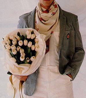| ’86年春夏型Kのエンブレムは、ダブルの麻のジャケットに付いて登場。ジャケット¥58,000、ペイズリ―プリントのシャツ¥21,000、コットンパンツ¥14,000、蝶タイ¥9,200 | Kのミニ・エンブレムが、綿のギンガムジャケットに付いて初登場。同じ時期に、ピンクハウスからPのミニ・エンブレムも出た。ジャケット¥29,000、シャツ¥13,500、プリントタイ¥6,000円、プリントスカーフ¥7,000、パンツ¥14,500 |