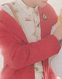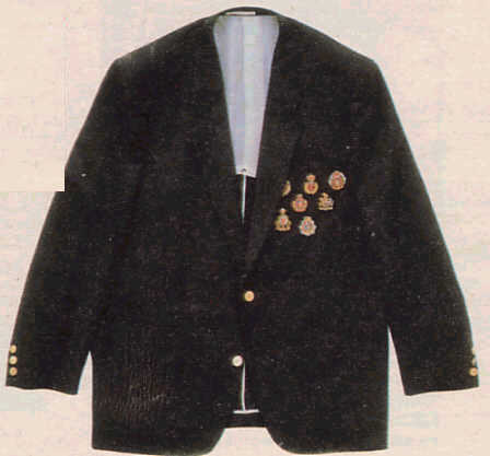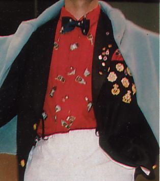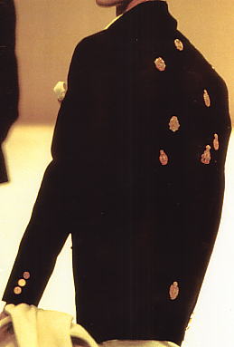 | 前シーズンに続いて、ミニ・エンブレム路線の商品は絶好調だった。ウールジャケット¥72,000 2つボタンでノーベントのボックス型シルエット。ミニ・エンブレム・ジャケットの最高峰だ。 | 「金子功のプリント絵本」32ページを見ればわかるが、ポケットチーフの裏の部分にもミニ・エンブレムが2個付いているので、全部で10個である。胸ポケットの上にもエンブレムが付いているのは、非常に珍しい。ラペルに付いているバッジは、別売品で1個2,800円。プリントは、ワイン柄。しかし、このジャケットは参考商品ではないだろうか? | 背中にミニ・エンブレムが8個付いたウールジャケット。参考商品。 |