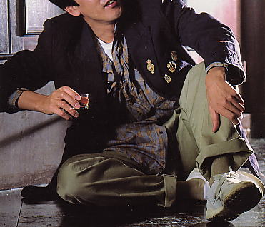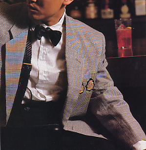 | ラペルに隠れて1個は見えないが、ミニ・エンブレムが3個付いた絹麻(シルクリネン)のジャケット。ギンガム・千鳥・グレンチェックの3種類の柄があった。ジャケット¥58,000、シャツ¥14,000、パンツ16,000、ボウタイ6,800、サスペンダー¥21,000 | 麻のダブルのジャケット。胸に3個、ラペルに1個ミニ・エンブレムが付いている。撮影の後、奥田瑛二さんが買い取った。この当時、カールヘルムを着ていた上岡龍太郎さんも白を購入。 |