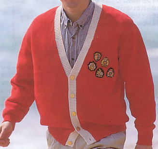| ラペルにミニ・エンブレムが、1個だけ付いたウールジャケット¥45,000、帽子プリントシャツ¥24,000、パンツ¥16,000、サスペンダー21,000 | カーディガン¥43,000、シャツ¥15,500 前立てだけ白で、金ボタンというのが素晴らしい。 |