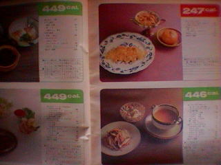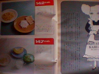 | 4号「レストラン〈カリカリ〉献立表」 この時代、既にダイエット特集が11頁にも渡り組まれているのは驚異的である。まさに、時代の最先端を走っている感じがする。カリカリ献立表は、朝食(142〜247i)を7種、夕食(446〜548i)を7種とりそろえてある。昼食は250〜300iの外食を、デザートに100iの果物とお菓子を紹介している。 |