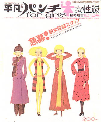 | 3号「新女性誌スタッフ募集」 新雑誌ananの編集スタッフ募集記事が平凡パンチ女性版の3、4号とも掲載された。この新女性誌編集スタッフ募集記事は、反響が大きかった。若い女性ばかりでなく、男性群にも興奮のウズがまきおこった。約5000人が応募してきた。応募した人のなかには、2003年現在、クリエーターとして活躍している有名人が多数いる。たとえばコピーライターの糸井重里さんも応募したと聞いているし、エッセイストの松山猛さん、ミュージシャンの近田春夫さんも応募した。募集職種はエディターから、ファッションディレクター、美容エディター、ホームエディター、料理エディター、イラストレーター、コピイライター、コラムニスト、グラフィックデザイナー、カメラマン、ファッションモデル、マンガ家などだが、お茶汲みなんかも職種に入っていて、当時はおおらかなものだった、という気がしてくる。 |