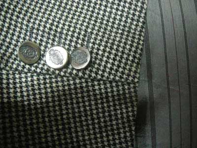 | 千鳥格子にエンブレムというのが実に嬉しいジャケット。好感が持てて、ちょっぴりトラディショナルな一面もうかがえます。外見から判断すると、大きめの柄よりも、このぐらいの、遠目には無地に見える小さめの柄の方が落ち着いて見えて、着こなしの点ではスッキリとまとまります。 | |