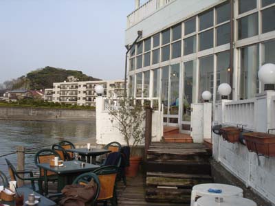| 葉山マリーナの隣りの公園の桜も満開でした。 | 葉山マリーナを出て、県道207号(森戸海岸線)を逗子方面に行くと、すぐに日影茶屋があります。左が日本料理、右が和菓子舗。 |