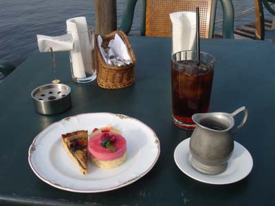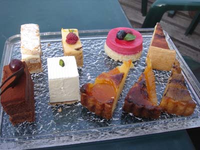 | 南仏風海辺創作料理「ラ・マーレ・ド・チャヤ」。1Fがカフェ。2Fと3Fがレストランになっています。ワンダフルハウスは、1階のカフェに入り、アイスティー(500円)と自家製ケーキを注文しました。ケーキは、サンプルを席まで持って来てくれて、好きなのを選ぶことができます。飯倉のアルカフェ・キャンティと同じですね。 | こちらが、ラマーレ名物「自家製ケーキ Tarte」でございます。旬の果物を使った季節のケーキと、素材の美味しさを生かした昔からの定番の数々。より多くのケーキを楽しめるように、食べやすいミニサイズになっています。日によって種類が替わります。2個600円。3個800円。さらに追加注文の場合、1個200円とお得です。 上段左から「アーモンドとなんとかのなんとか」「紅茶のムース」「木苺のムース」「ベイクドチーズ」。 下段左から「ショコラ」「レアチーズ」「杏のタルト」「洋梨のタルト」「チョコとバナナのタルト」 それでは、これとこれをください(^Q^) |