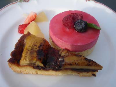 | 選んだケーキが盛り合わせになってきました。「チョコバナナタルト」と桜色が綺麗な「フランボワーズのムース」。タルトは、生のバナナがキャラメリゼされていて超美味(^Q^) | |