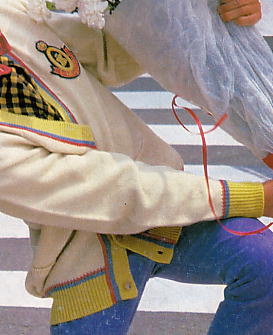 カーディガン¥37,000、チェックBDシャツ¥13,500、靴¥31,000(カールヘルム1985年秋冬物)。Kのエンブレムが付いた1企画のピンクのカーディガンは、今では超貴重品。1ヶ所だけアクセントにチェックをきかす着方をしている。これも簡単なようでいて失敗すると、チェックだけが浮いてしまう。金子さんはその点、カーディガンの前立てと袖口の赤とソックスの赤を効果的に用いることによって、色使いに細心の注意を払っている。これがプロのカラーコーディネートなのである。おなじみのパンチングシューズもブランド設立当初から作られていた。