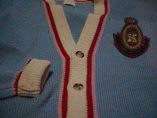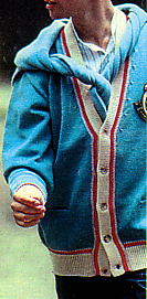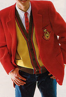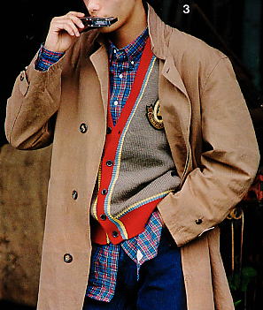 セーター¥65,000、シャツ¥11,000、ネクタイ¥8,000(カールヘルム1985年秋冬物)。ブルーのアーガイルVネックセーターは、カシミヤ100%。ハデな色ほど安っぽくならないように上質な素材を使用している。シャツは、当時流行のショートポイント(チビ衿)のレギュラーカラー。ネクタイは、前年にパリのイスランドで買った(「金子功のパリでいいものみつけた(’84年版)」に出てくる)ものを真似した。チェックの大きさ・色共に同じである。ジーンズは、長年はき込んでいるリーバイス。写真では、靴は見えないが、素足であることから、白いキャンバススニーカーに間違いない。