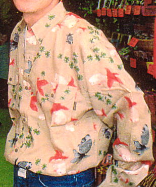 | 3ワッペン付きジャンパー¥59,000 写真2の金魚シャツの上に水色のジャンパーを着て、赤いセーターを羽織っている。。 | |