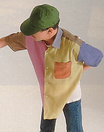 | 1熱帯魚プリントシャツ¥19,500、鯉のぼりプリントポーチ¥4,300、コンビの靴¥31,000(カールヘルム)「このバッグ、カールヘルムの定番なんだけど、原型はアーミーなんです」「バッグ、特に男ものというのは機能的でなくちゃしようがないと思うんです。男がデカイカバンを毎日ぶらさげて歩く、というのもあまり好きじゃないんです」「男の必需品――財布、キー、タバコにライター、それに眼鏡くらいはラクに入る収納力はあります。現に僕も同じサイズで革製のものを毎日持って歩いてるけど、不自由は感じない」「同じ柄のアロハも作っているんですが、カバンのほうが抵抗なく”男のハデ”を実践できるんじゃないかな」コンビのパンチング・シューズも定番商品です。「知り合いのスタイリストがパリで買ってきたアンチックの靴が素敵でね、ほんとのこというと、真似したわけ」 |
