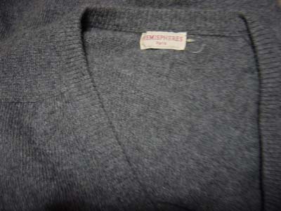 | 青山のエミスフェールで1994年に49,000円で購入したスコットランド製のカシミヤ100%Vネックセーター。金子さんが「いいものみつけた」で勧めてるのはこの色だ。霜降りグレーというか、チャコールグレーっぽい色。カシミヤのニットというと、ジェーン・バーキンを真っ先に思い浮かべる。素肌にカシミヤのセーターというイメージが強いが、実は父親の遺品のボロボロになったランニングを下に着ているのだ。彼女が最も愛用しているのは、ブルーとグリーンがミックスになった色だが、このグレーもよく着ている。ダーク・ボガートと共演した「ダディ・ノスタルジー」では、グレーのVネックとカーディガンをステンカラーコートなどと組合せて着ていた。 |