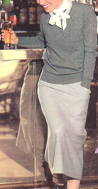 | カシミアのセーター¥29,000(リーゼントハウスで1979年に売られていた物)シルクのブラウス¥29,000(ピンクハウス1979年秋冬物)モデルはユリさん。タイトスカートと黒のハイヒールはブランド不明。おそらくピンクハウスのものであろう。リーゼントハウスにちなんだのかどうか知らないが、ユリさんが髪型をリーゼントでキメている。意外にも宝塚の男役も真っ青になるほど似合ってるのである。 |