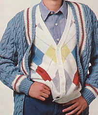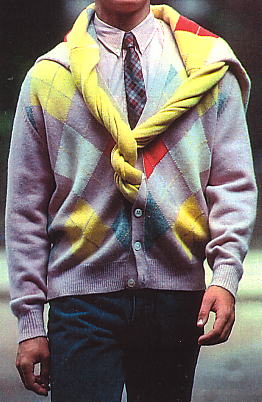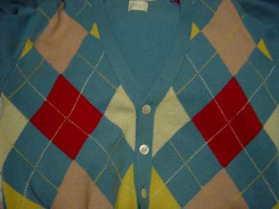 | 1985年秋物。カールヘルム設立当初に発売された商品でカーディガンとVネックがあった。「金子功のブラウス絵本」で見れるが、金子さんは、これのVネックを買った。水色ベースに白&赤&黄&ピンクという色の組合せがパリっぽくて、やはりエミスフェ―ルの影響を受けているようである。この5色にライトグレーを加えた全部で6色展開だった。カシミヤ100%でカーディガンは69000円。Vネックは65000円。ジャケットやコートより高かった。 |