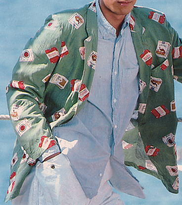 | ジャケット¥33000、パンツ¥14500、ストライプシャツ¥13500(カールヘルム1986年春夏物)このタバコプリントは、ジャケット・シャツ・タイ・スカーフとワンポイントのTシャツが作られた。商標登録に引っかかるため、「CAMEL」は「CANEL」に、「Winston」は「Winstan」と1字替えているが、現在は権利関係がきびしくなってしまったため、復刻できなくなってしまった。まさに幻のプリントである。レーヨンプリントのジャケットは、’87年春夏の帽子柄シングルジャケット(¥37000)、国旗柄マオカラージャケット(¥24000)以来、作られていない。 |