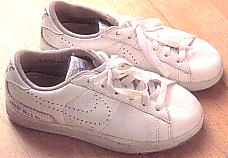 | ヘインズのTシャツ。「子供ものがなかなか日本では見つからなくて、ずっとパリで買ってたけど、この間、やっと青山で見つけたの!」薄くてクシャッとした感じ。日本製の丈夫で上等なコットンではイマイチこの感じが出ない。 | ブランドは不明。「私のお母さんがイギリスにいるでしょ。毎年里帰りするの。そのときパリに寄って買ってきます」あたり前のストンとしたシルエット。ここにこだわります。「日本のは、どこかデザインしてあるのね。好きじゃない」 | ラルフ・ローレンのPOLO。「今までポロシャツはラコステを買ってたんですけど、たまたまデパートで見つけて最初は白だけ買ったんですけれど、着せてみたら、なかなかだったので、あと4色揃えました」衿が小さいところと、全体のプカッとしたシルエットが気に入りました。 | ナイキのテニスシューズ。「同じのを2足持ってる。1足はテニス教室用。1足はふだん用ね」 |