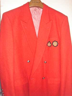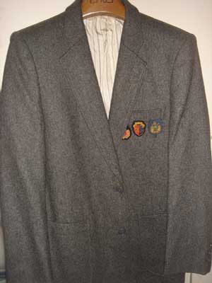 | ブレザーを演出する大切なポイントとなるエンブレムも、金子さんの手にかかると、ご覧の通り。本来のトラッドではマストハブとも言えるエンブレムを思いきって胸に3つも飾っちゃうあたり、ルールにとらわれず遊び心に溢れてます。グレーフランネルの3つボタン段返りのジャケット。今見ると、学校の制服風でもあります。 | こうなるとどこか新鮮な感じがします。 |