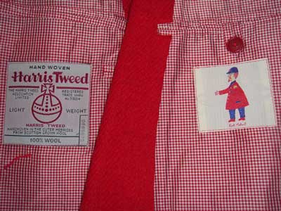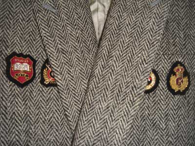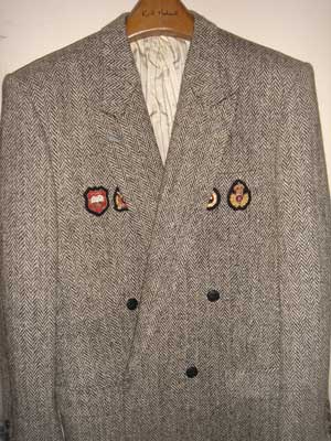 | 胸ポケットにミニ・エンブレムを2個付けて、さらに左右対称となる位置にも2個付けてしまいました。金子さんは、この当時、このような楽しいアイディアをたくさん見せてくれました。ピークドラペルでダブルブレスト、ヘリンボーン柄のハリスツィードジャケットとなると、本来は重厚でクラシカルな雰囲気になりますが、ミニ・エンブレムの効果で、軽くてPOPな雰囲気になっています。 | |