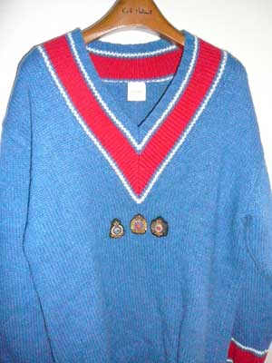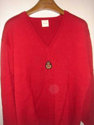 | 1986年秋冬シーズンは、ミニ・エンブレムを付けたセーターが登場しました。Vネックで中央に3本のケーブル入り、胸の中心部ででケーブルを寸断して、そこにミニ・エンブレムを付ける。シンプルなようですが、非常に凝ったデザイン。実際の色はエンジ、右の写真の方が近いです。 | |