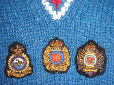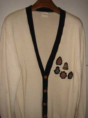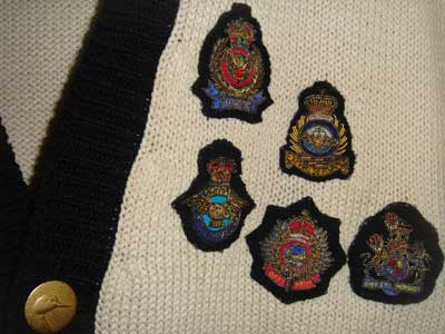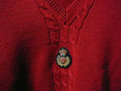 | クリスマス・カラーのウールの縄編みカーディガン。ワンダフルハウスは毎年12月に1〜2回だけ着て、クリスマスが過ぎると、さっさと仕舞ってしまいます。色は右の写真の方が近いです。カールヘルムでは、この形のミニ・エンブレムは、1986年秋に初登場して、ジャケットやジャンパーやニットに多用されましたが、このシーズン(1987年秋)を最後に使われなくなりました。英国の軍隊の正式なエンブレムを、そのままの形で縮小したものです。造りが丁寧で、小さくても高級感がありますね。 | |