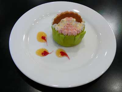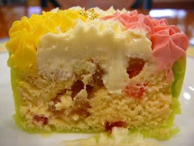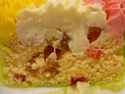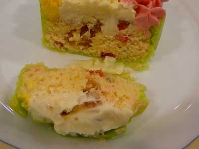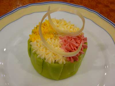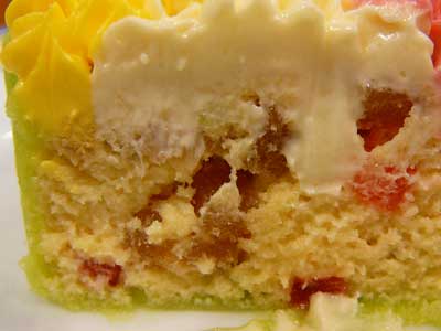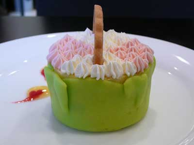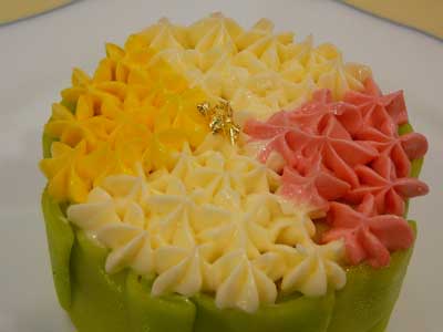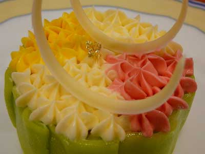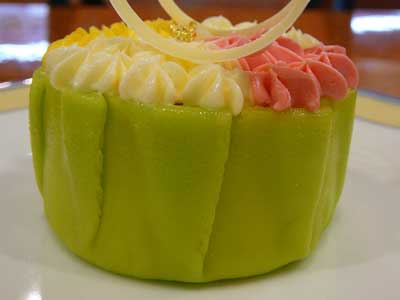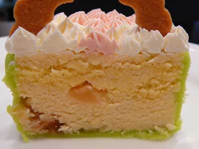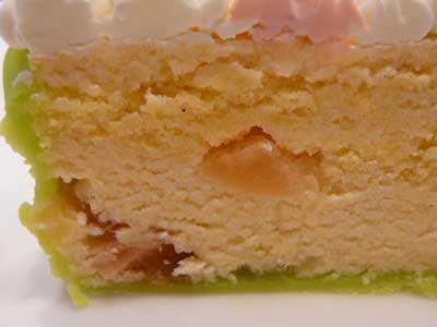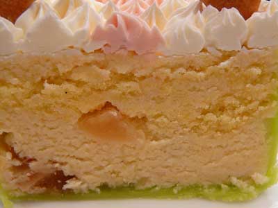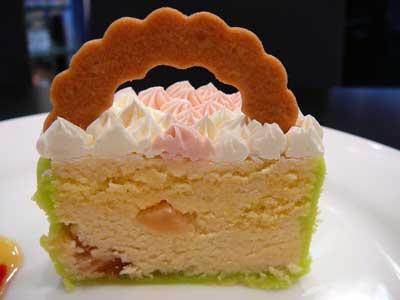 | 砂糖、卵、小麦粉、溶かしバター、洋酒で作ったジェノワーズを2枚にスライスし。1枚のジェノワーズへクレーム・パティシエールを塗り、そこへキルシュに漬け込んだドライフルーツをふんだんに散らします。さらにクレーム・パティシエールを塗り、もう1枚のジェノワーズをかぶせます。マジパンで覆い、バタークリームで優雅に飾りを施し、ビスケットのハンドルを付けて出来上がり。 |
