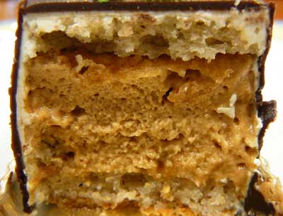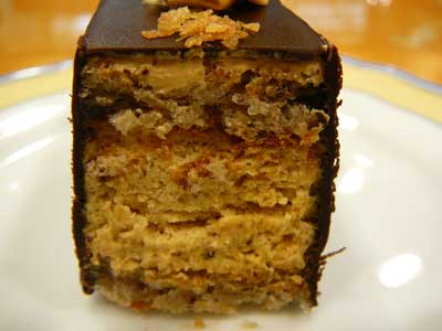| ガトー・ショコラをカットしてみると何層にも別れていました。口の中に含んだ瞬間、ふわっと溶けて、間に挟んだへーゼルナッツのバタークリームの香りがいっぱいに広がります(^Q^) サックリしてるけどふんわりモチモチ…普通のビスキュイとは違う、独特の食感があるこの生地は…「ダックワーズ Dacquoise」に近いです! |