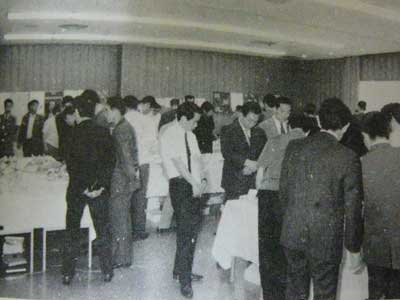 | この人たちは全国から集まってきた1970年代のパティシエです。ワンダフルハウスはタイムマシーンに乗って、1971年6月4日に行われた東京の洋菓子店56店舗の合同試食会にやってきたのです 〜/(^O^)/ |