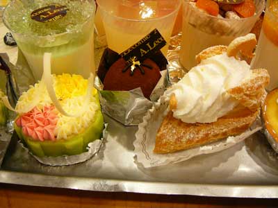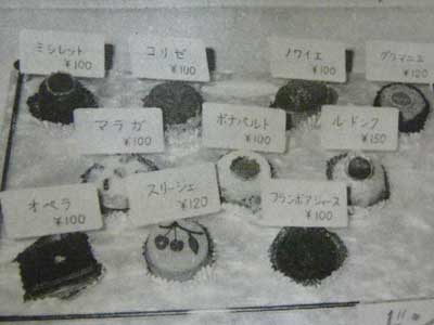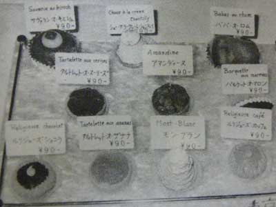 中段左からミックスフルーツパイ80円、スウリー120円、ガトウショコラ(現在のパトリシアンまたはガトー・ミュゲ)120円。