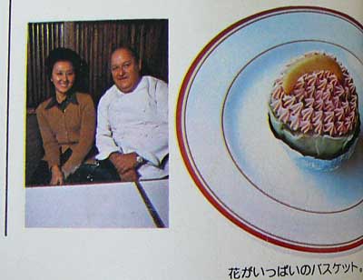 | シュー・パリジェンヌにクリームを絞りながら「女性への愛を込めて美味しいケーキを作ります(^_-)-☆」と語る、1971年当時のアンドレ・ルコントシェフ。後ろに写っている見習いの若いパティシエが38年前の島田進シェフです。見習いの中でも一番ベテランで3年目に入っており、スーシェフといったところでしょうか。 |