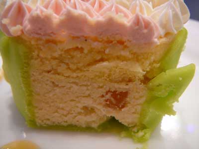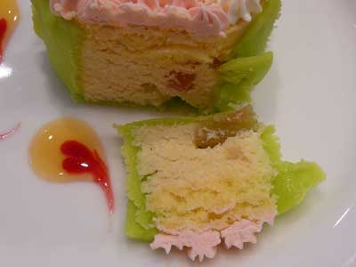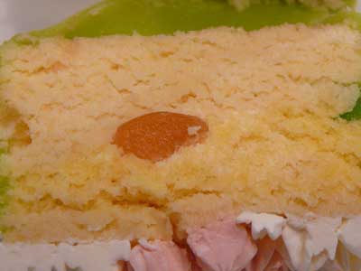 | グリーンのガトーをカットすると、キルシュ漬けのフルーツが宝石のように散りばめられています。 |