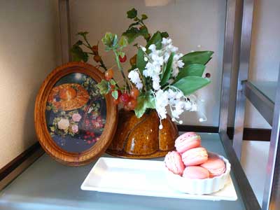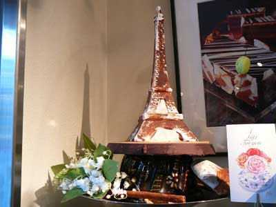 de muguet)やスズランをデザインしたアントルメ、プティガトーが並び、鉢はヌガーやチョコレートで作り、中にクリームをつめます。昔は飴細工のスズランを飾っていたのですが、最近はプラスチックを用いるようです。