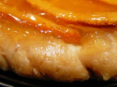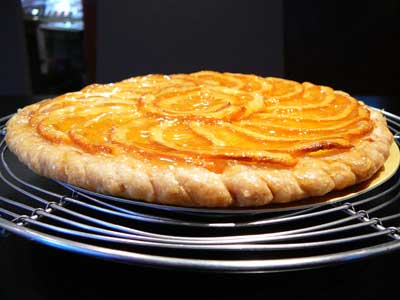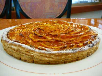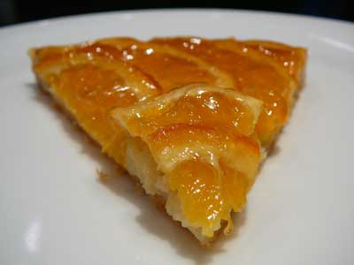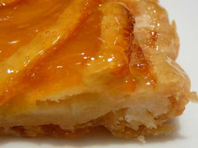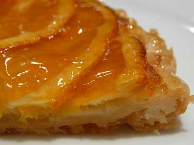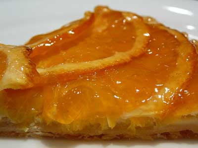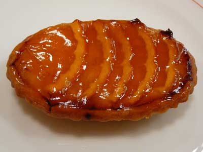 | 島田シェフのガレット・オランジュの原型は、師匠であるアンドレ・ルコント氏のタルト・オランジュにあるのは一目瞭然です。こちらもフィユタージュ生地で白っぽいクレーム・ダマンドが詰まっています。 | |