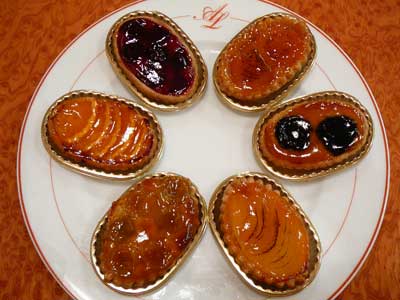 | こちらはプチガトーサイズの舟型のタルトレット。フィユタージュ生地で普通のベージュっぽいクレーム・ダマンドが詰まっています。 | |